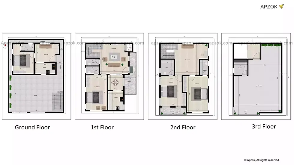 This is a 30 40 south face house plan 3bhk with 2bhk plot, primarily constructed for rental purposes. Projection of the house is towards south Vastu design. rental floor and first floor is reserved for tenants and has vastu compliant 3 bhk apartment with private balcony, utility area, and puja space, also embellished with nice features like a small utility balcony accessible from the bedroom. The lower floor has a 2BHK rental space for and ancillary parking region. There is ample parking available Mid terraces contain private accessible space and the rest is used as open terrace. To enhance OTS ventilation within the living area, a designated Open-To-Sky (OTS) space is conveniently located in the lower region of the hall. There is also a utility room provided on the upper deck. To the rear and right side, the designated setback is roughly 30 - 35 centimeters.
