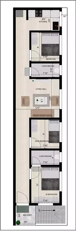 A balcony sized of 12.2 x 14.4 ft is placed in the west direction which is ideal for gardening and simply admiring outdoor views. Main door placed at the northwest which direct connect to the living hall. Stairs is in the south direction which moves to the north that ease movement to the upper floors.
