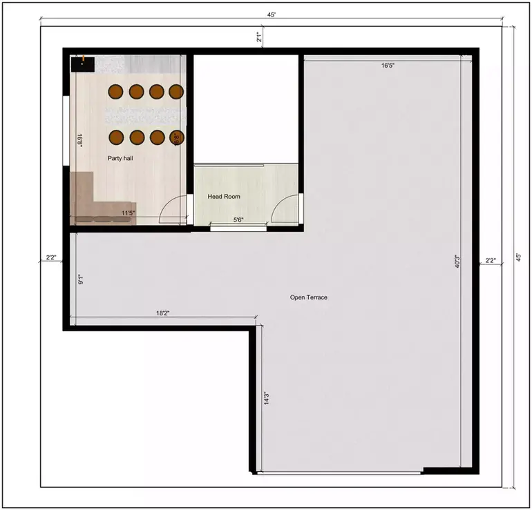 The terrace floor party hall located in the southeast direction measuring about 11 feet 5 inches and 16 feet 8 inches Headroom is very spacious which connects with the party hall The terrace measures about 16 feet 5 inches and 40 feet 3 inches