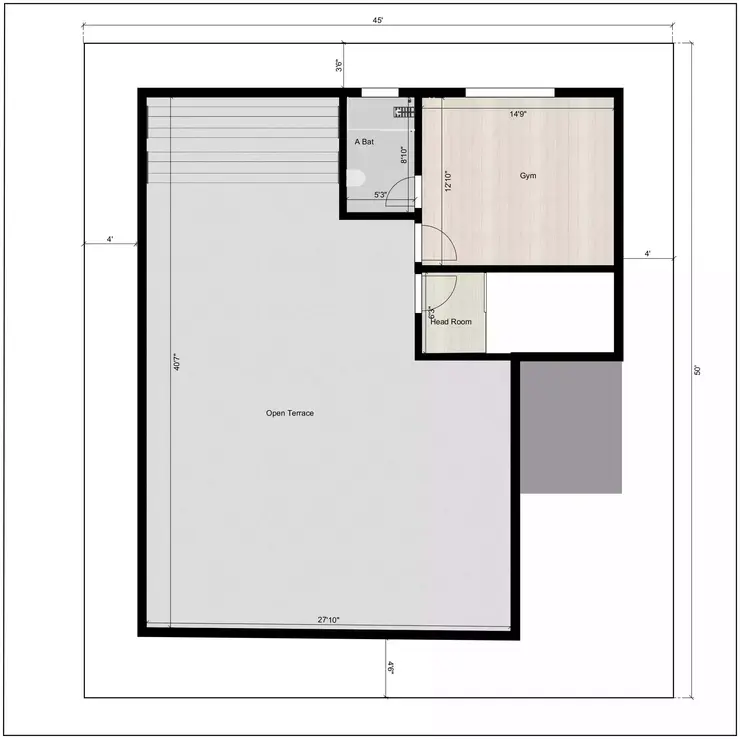 The terrace floor consists of spacious open terrace measuring about 27 feet 10 inches and 40 feet 7 inches with a gym area in the northwest direction measuring about 14 feet 9 inches and 12 feet 10 inches with an attached bathroom measuring 5 feet 3 inches and 8 feet 10 inches.