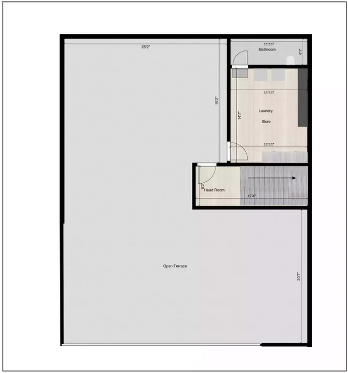 The terrace floor consists of spacious open terrace measuring about 25 feet 2 inches and 20 feet 7 inches. The laundry room located in the southwest direction measures about 11 feet 11 inches and 14 feet 7 inches, with an attached bathroom measuring about 11 feet 11 inches and 4 feet 1 inches. The headroom measures about 17 feet 4 inches and 6 feet 2 inches.