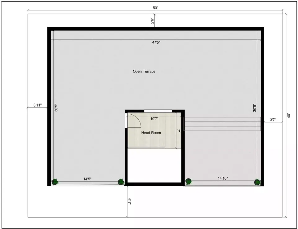 The terrace floor consists of large open wide terrace measuring about 41 feet 5 inches and 30 feet 5 inches with a small headroom measuring about 10 feet 7 inches and 7 feet.