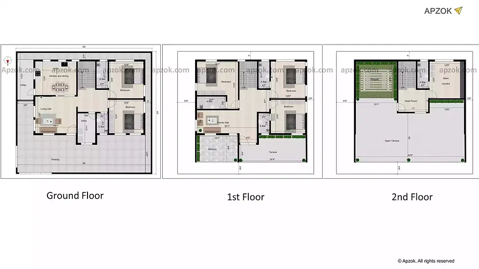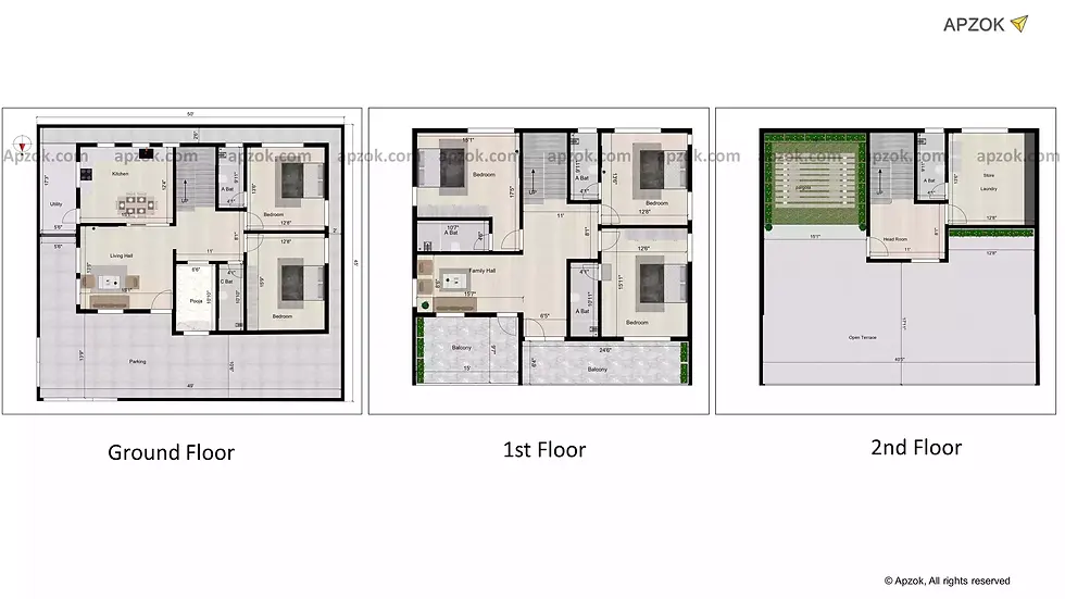 A three-floor building. The ground floor consists of a spacious parking area, living hall, laundry space, kitchen, common bathroom, dining area, two bedrooms with attached washroom. The first floor consists of two bedrooms with attached washroom, study room, balcony, puja room, family hall, and terrace. The terrace floor consists of a gym area along with the open terrace.